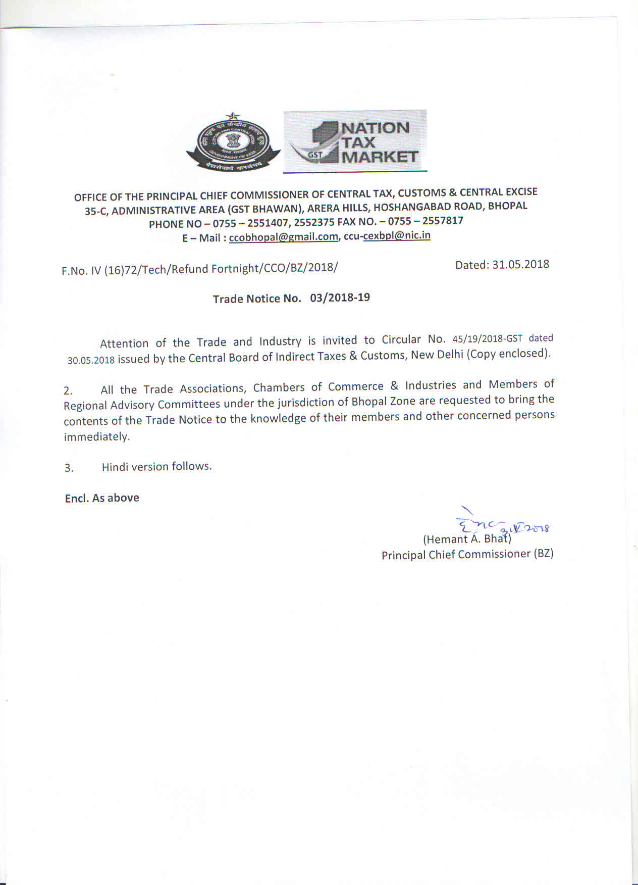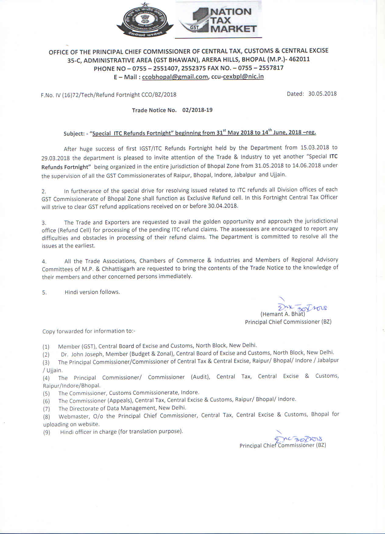 trade Notice No. 04/2018-19. dated 09.07.2018 of Bhopal Zone
