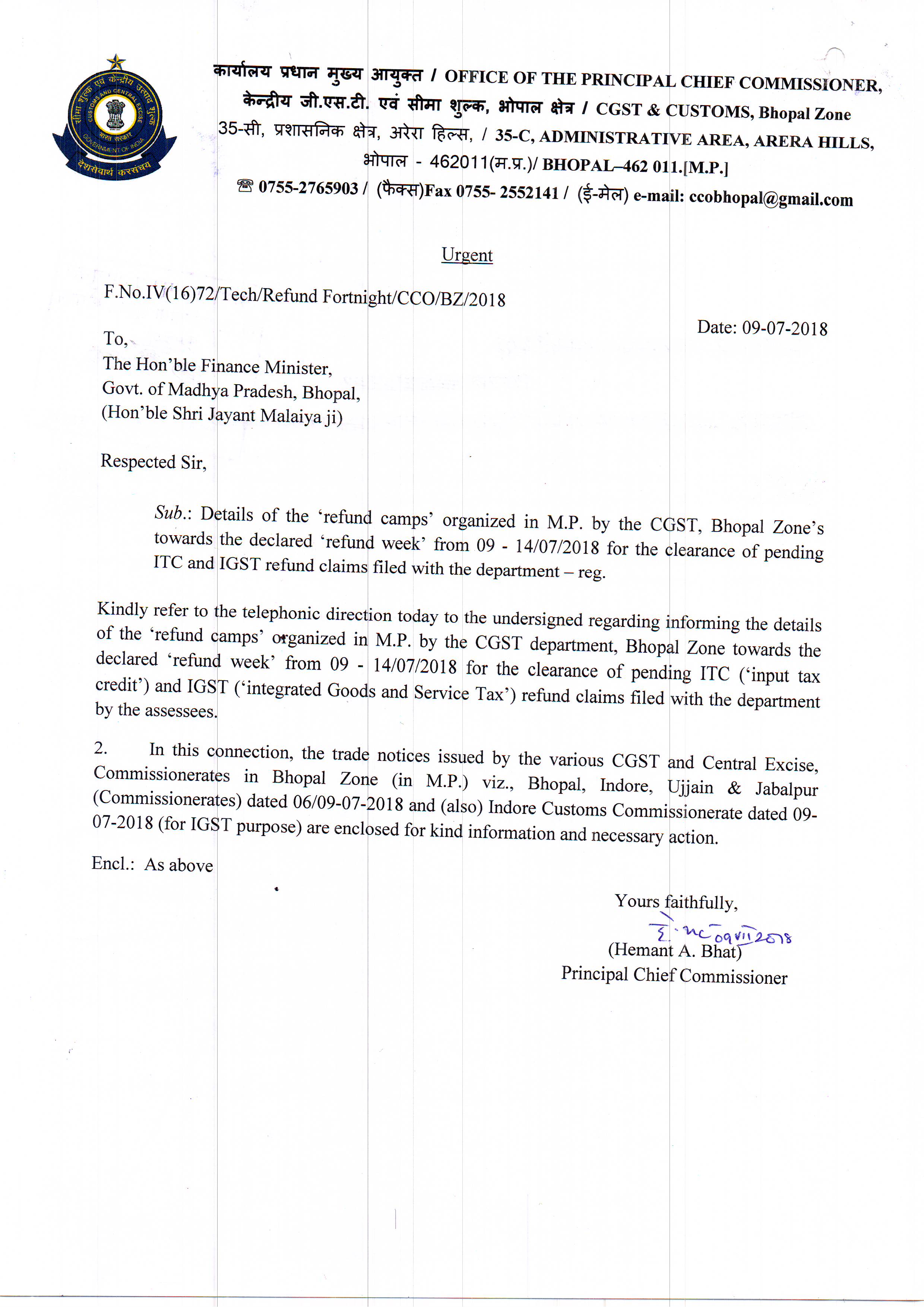 Letter dtd. 09.07.2018 to Hon'ble Finance Minister of MP regarding organising of Refund Week