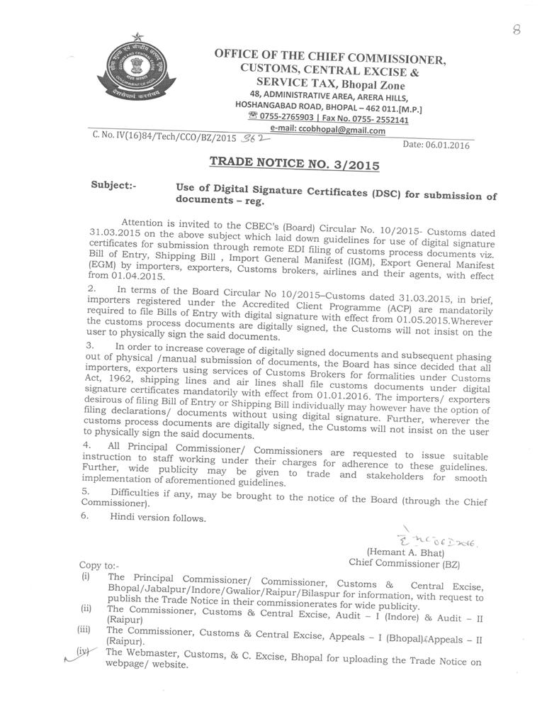 trade Notice No. 01/2023(Customs). dated 31.03.2023 of Bhopal Zone