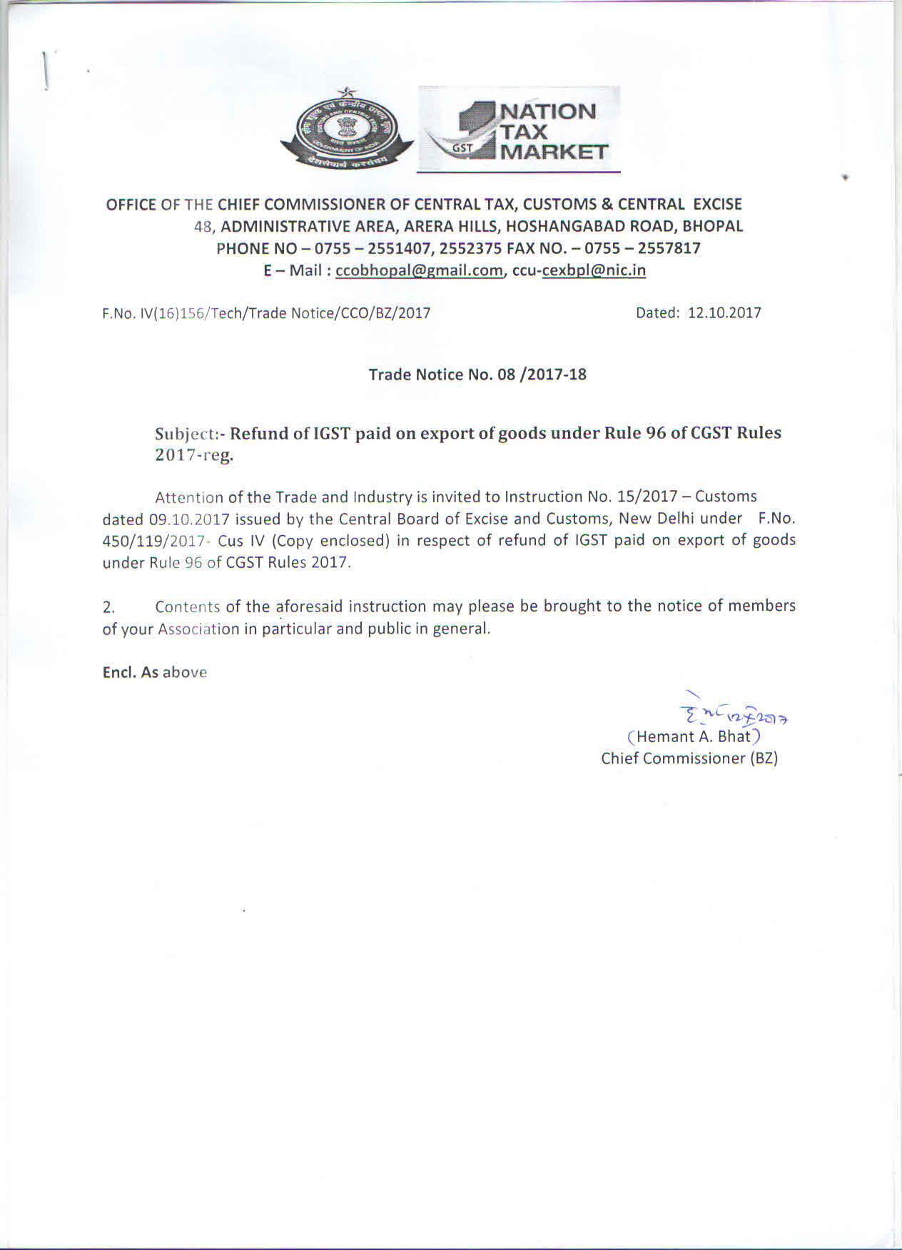 trade Notice No. 05/2018-19. dated 17.07.2018 of Bhopal Zone