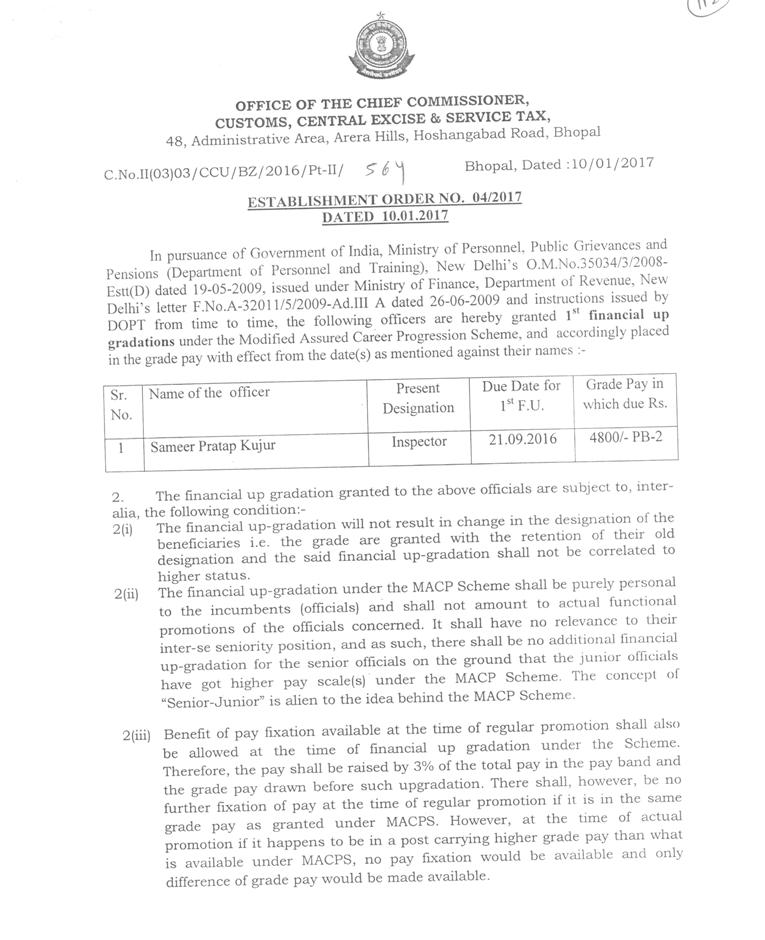 Order No. 04/2018 dtd. 11.01.2018 in r/o Group 'B' & 'Gr'C' officers of Bhopal Zone