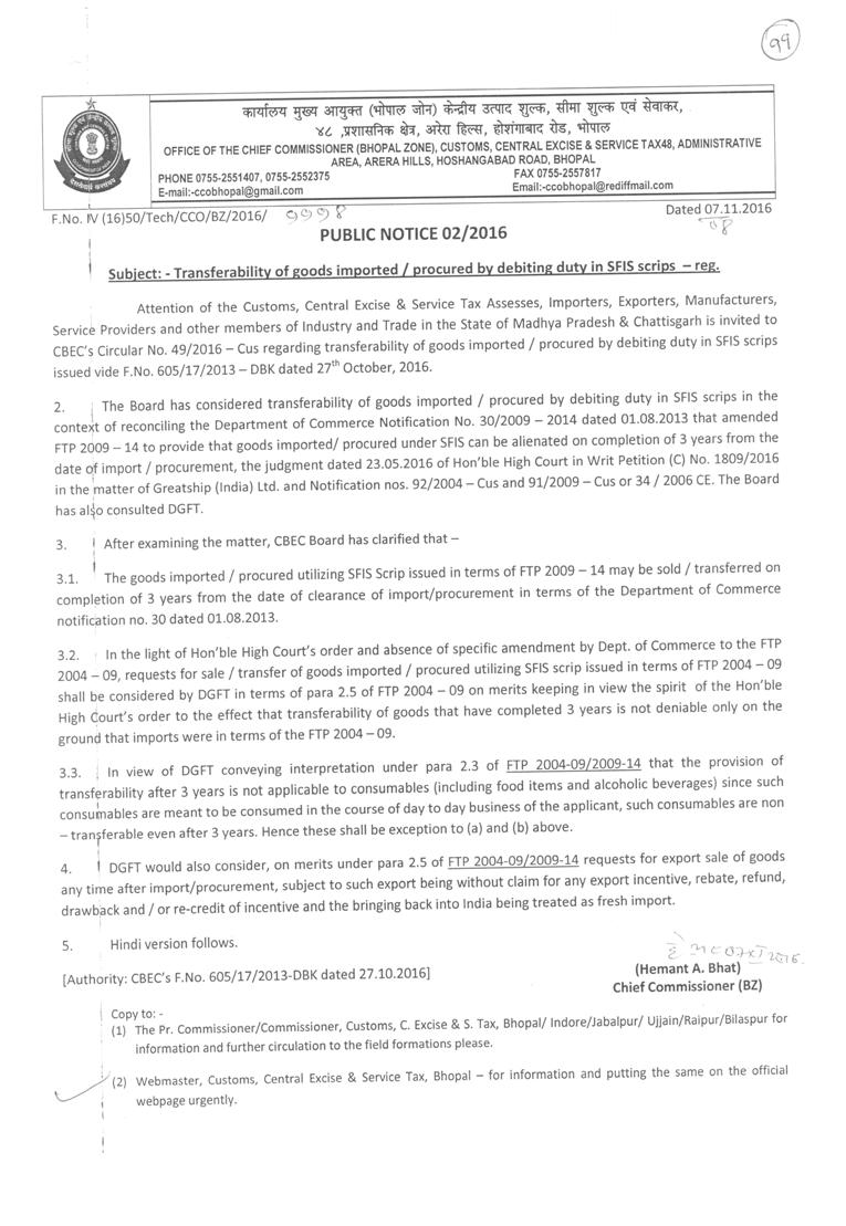 Transferbility of goods imported /procured by debiting duty in SFIS script (public Notice 2/2016)